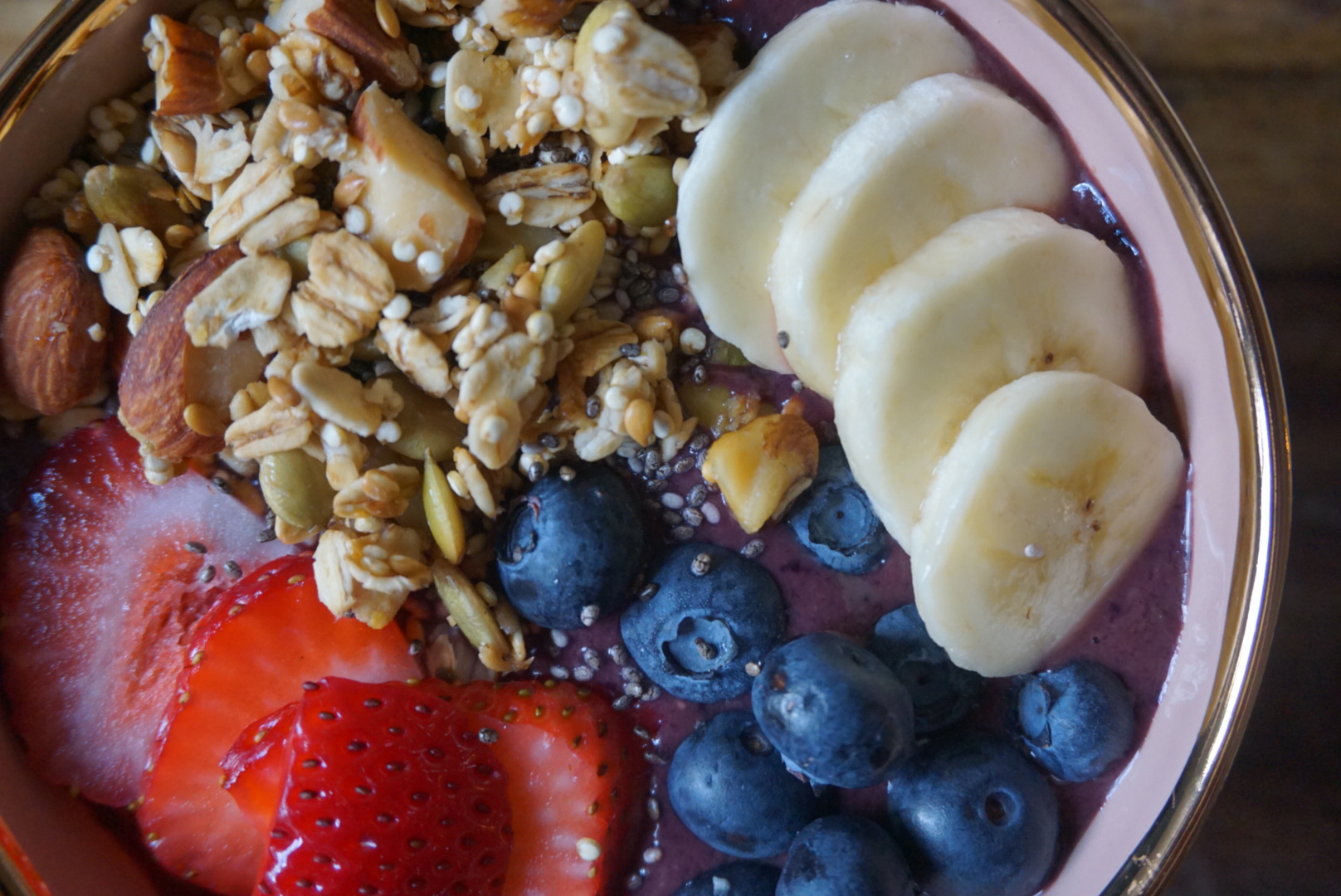 Acai is used as the base of this smoothie bowl. In the U.S., you can’t buy acai berries as whole fruit, instead you can find them in powder form or frozen puree both available at Whole Foods. Finding acai is only half the battle though, it’s getting the right texture that’s the real tricky part. You want a consistency that is s not too thick and not thin. You are looking for the perfect blend to create a scoopable smoothie-like texture. I created mine using powered acai, a frozen fruit mixture, ripe bananas, and almond milk.