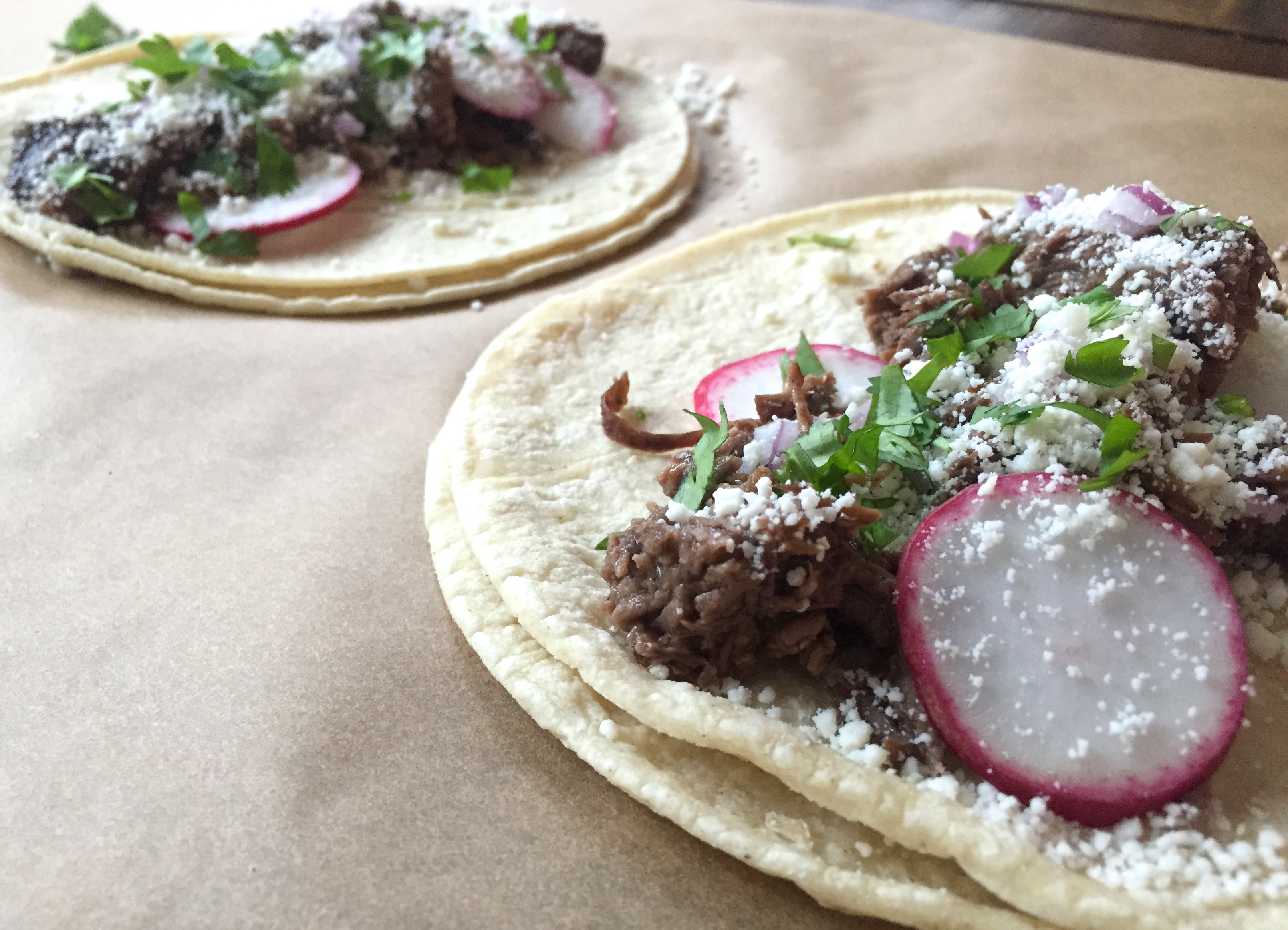 - Place shredded pork on top of 2 corn tortillas, then top with sliced radishes, cotija cheese and chopped cilantro.