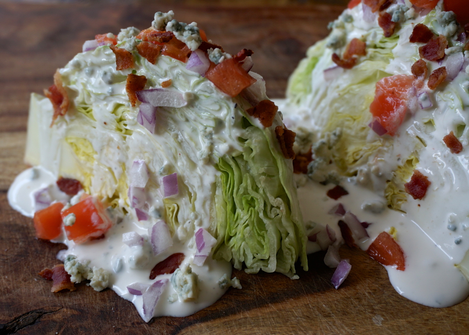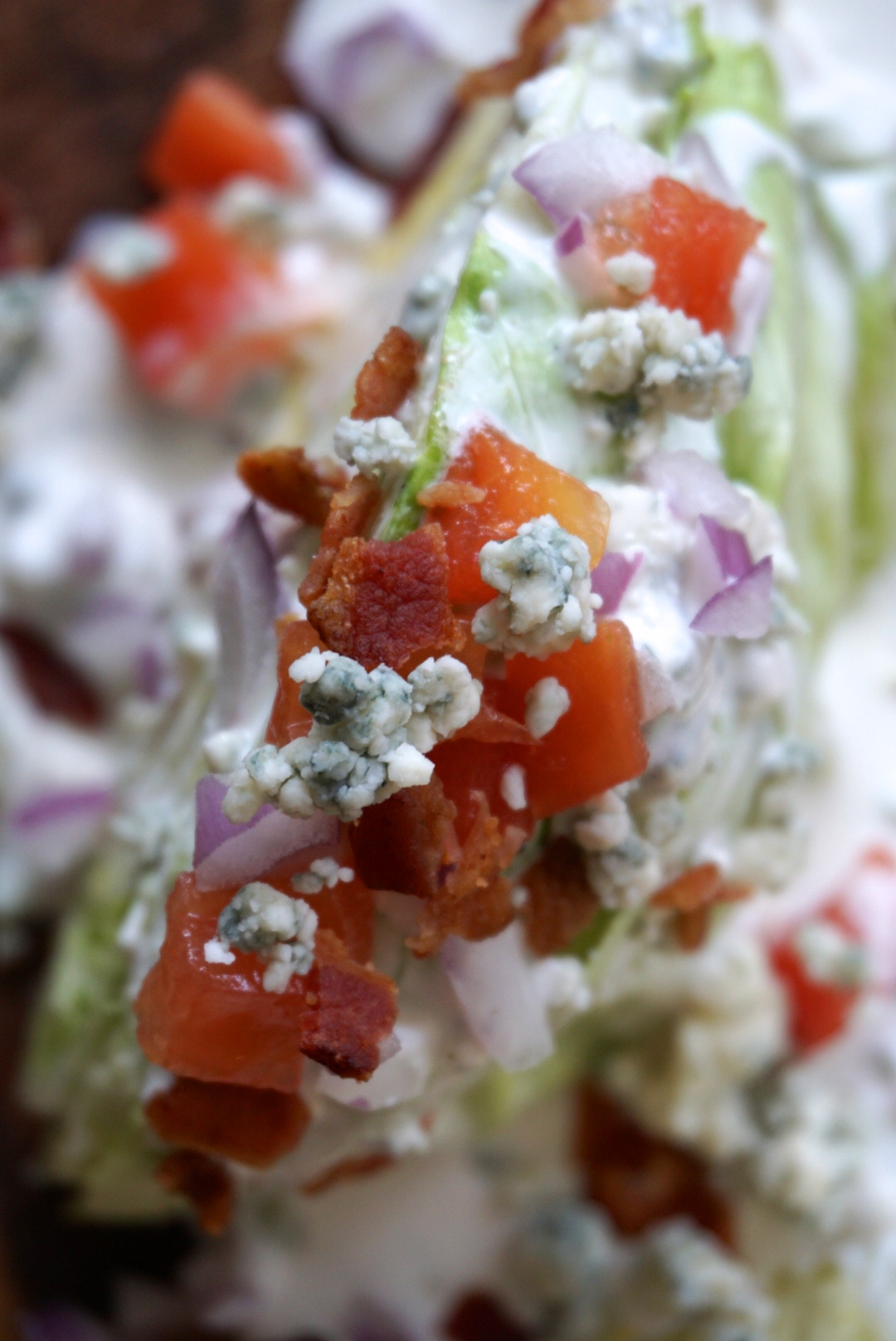 - A big head of iceburg lettuce, diced tomatoes, chopped red onion, crisp cooked bacon and blue cheese for the toppings.