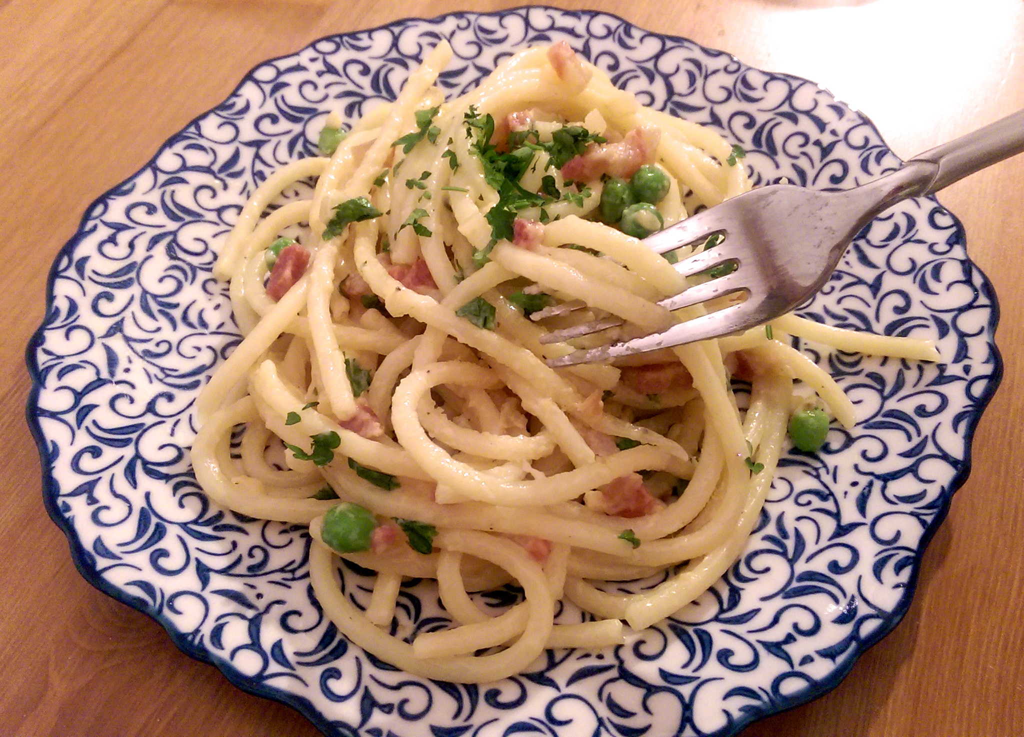 My recipe uses bucatini noodles, which are thick hollow noodles perfect for soaking up the egg, parmesan and cream sauce. Adding my own twist to this wonderfully indulgent dish, I cooked up thickly sliced pancetta and added in fresh green peas for some color.