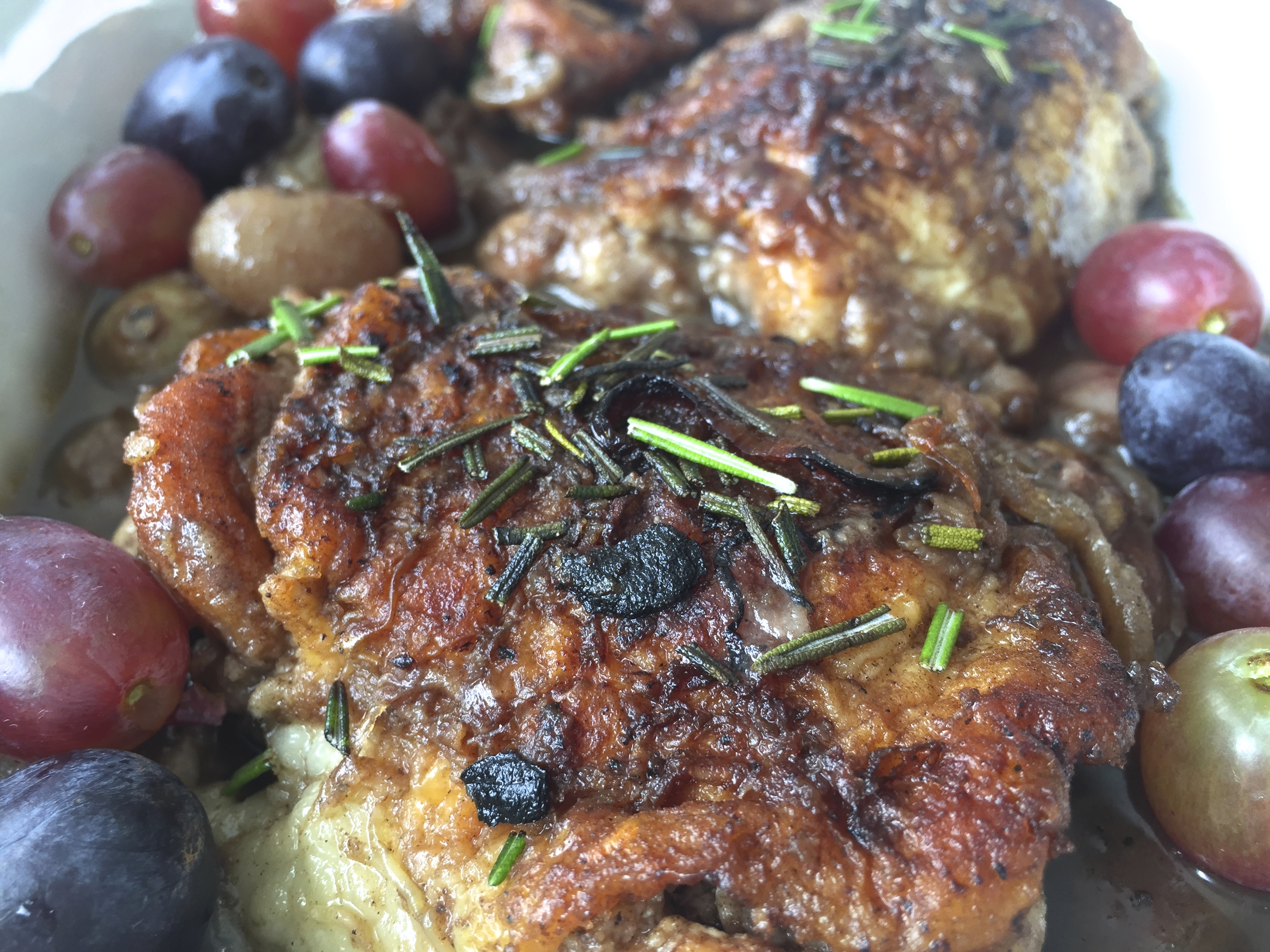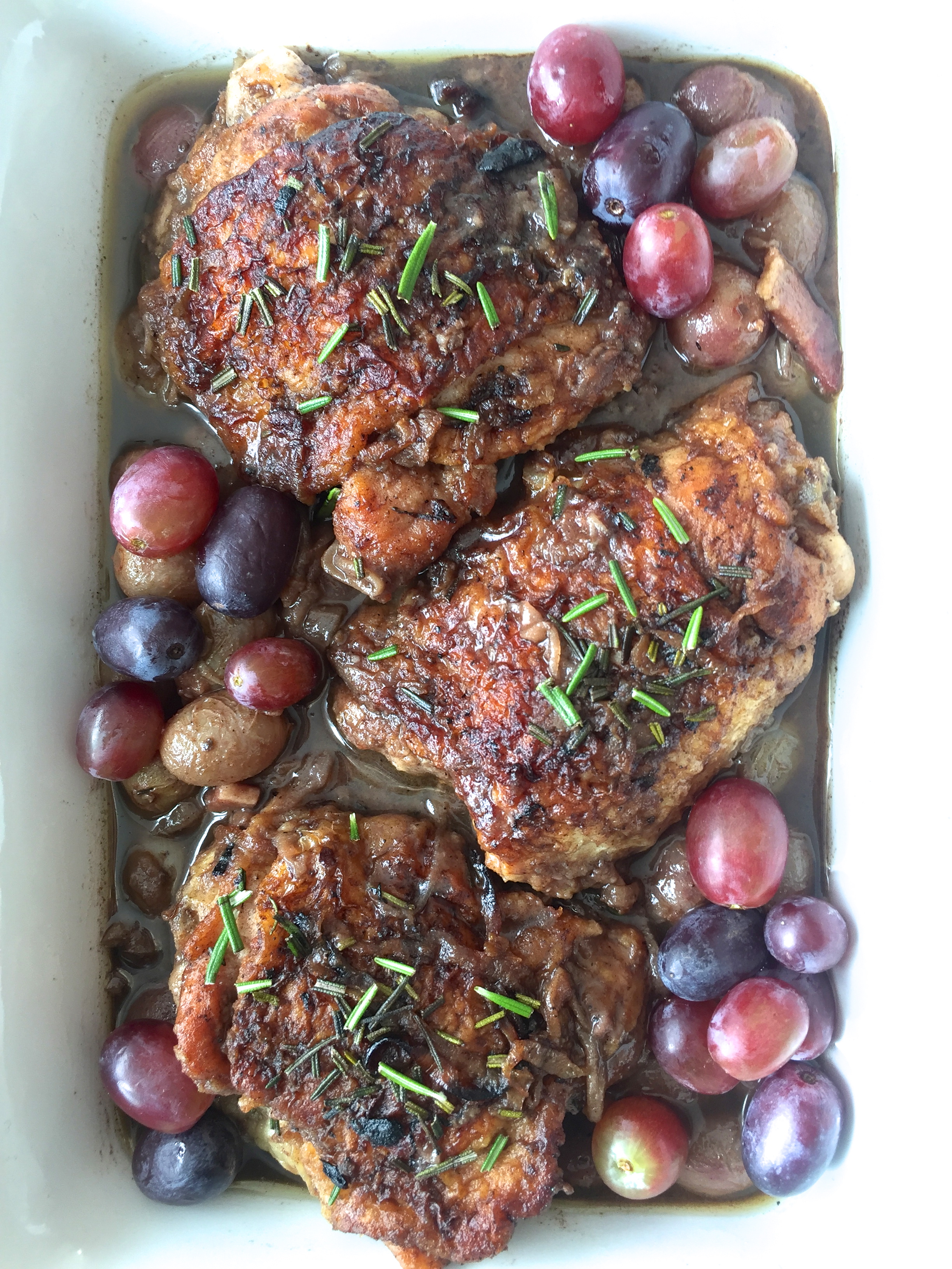 Anything that has been braising in a delicious broth or wine based sauce is automatically going to be delicious. That’s just a fact. But this recipe is so much more than a red wine and chicken broth reduction. The browned caramelized onion, thick bacon and crispy chicken thighs create a deliciously balanced dish, but the real star here is the unique addition of the red grapes. They add a hint of sweetness and, when cooked down, create a wonderful texture.