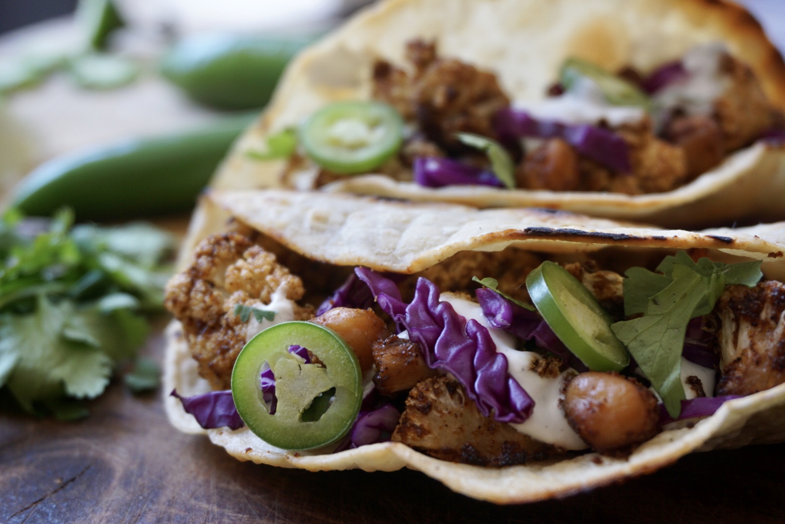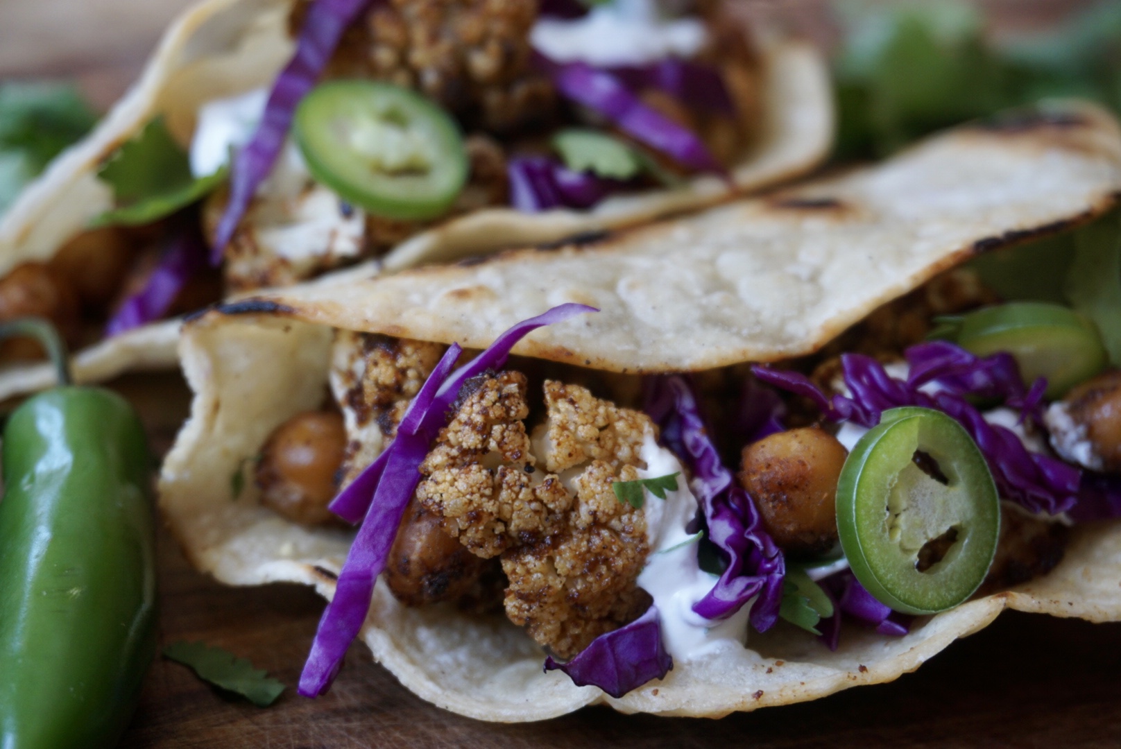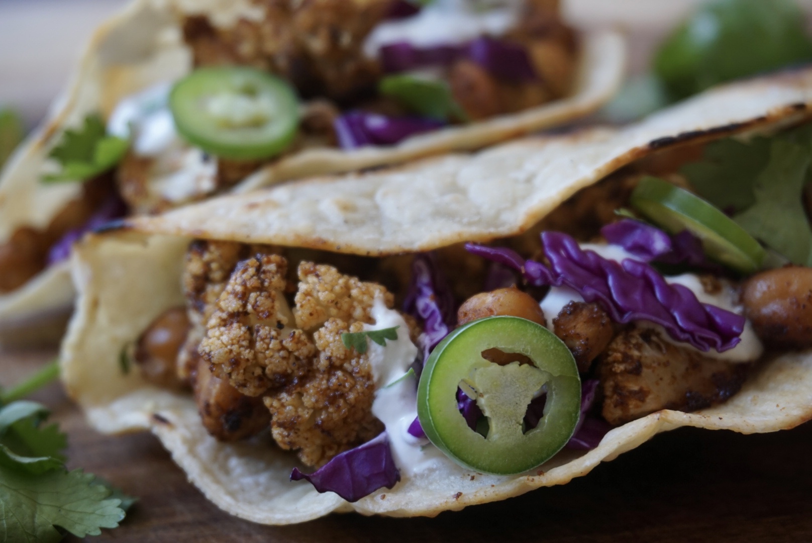 - Roast a flour tortilla stovetop until crispy and place roasted cauliflower and chickpeas on top. Top with red cabbage, jalapeño slices, avocado, and cilantro. Drizzle lime crema over the tacos and serve!