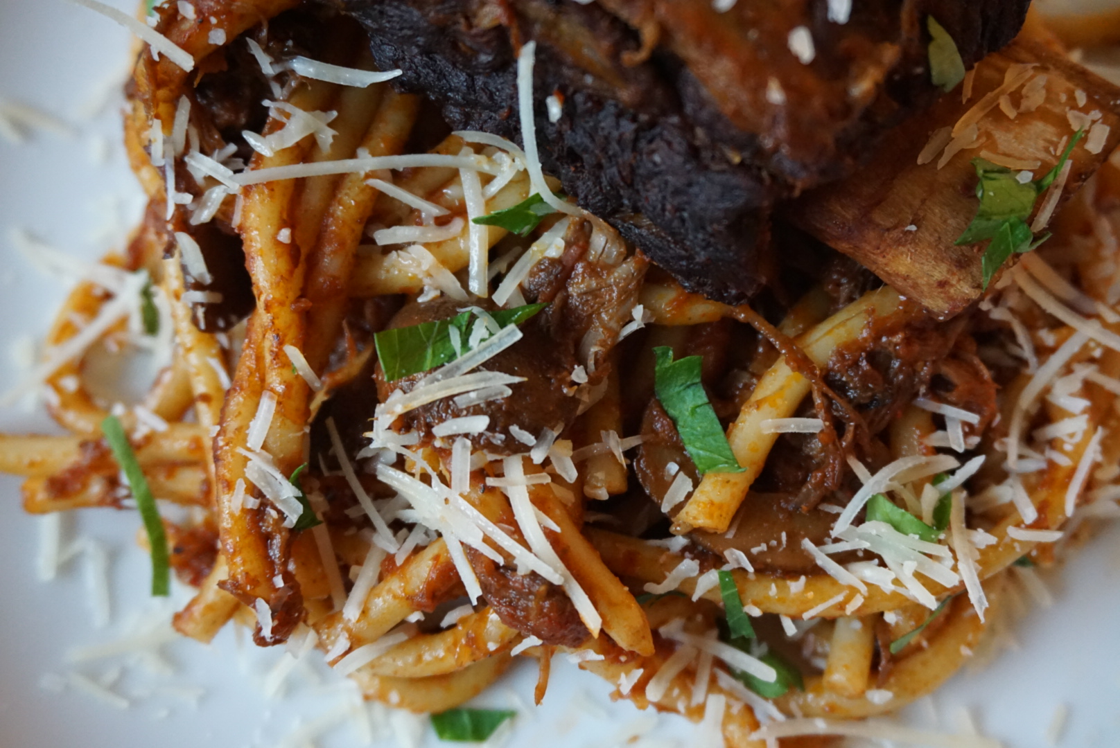 Once the ribs are braised, remove from the slow cooker and pull them off the bone (if they aren’t already) with a fork and add them back into the sauce. Then add a tiny bit of brown sugar and parmesan cheese. Stir sauce together and serve over bucatini with extra cheese. Pairs well with wine, a blanket and in my case a cold. Enjoy!