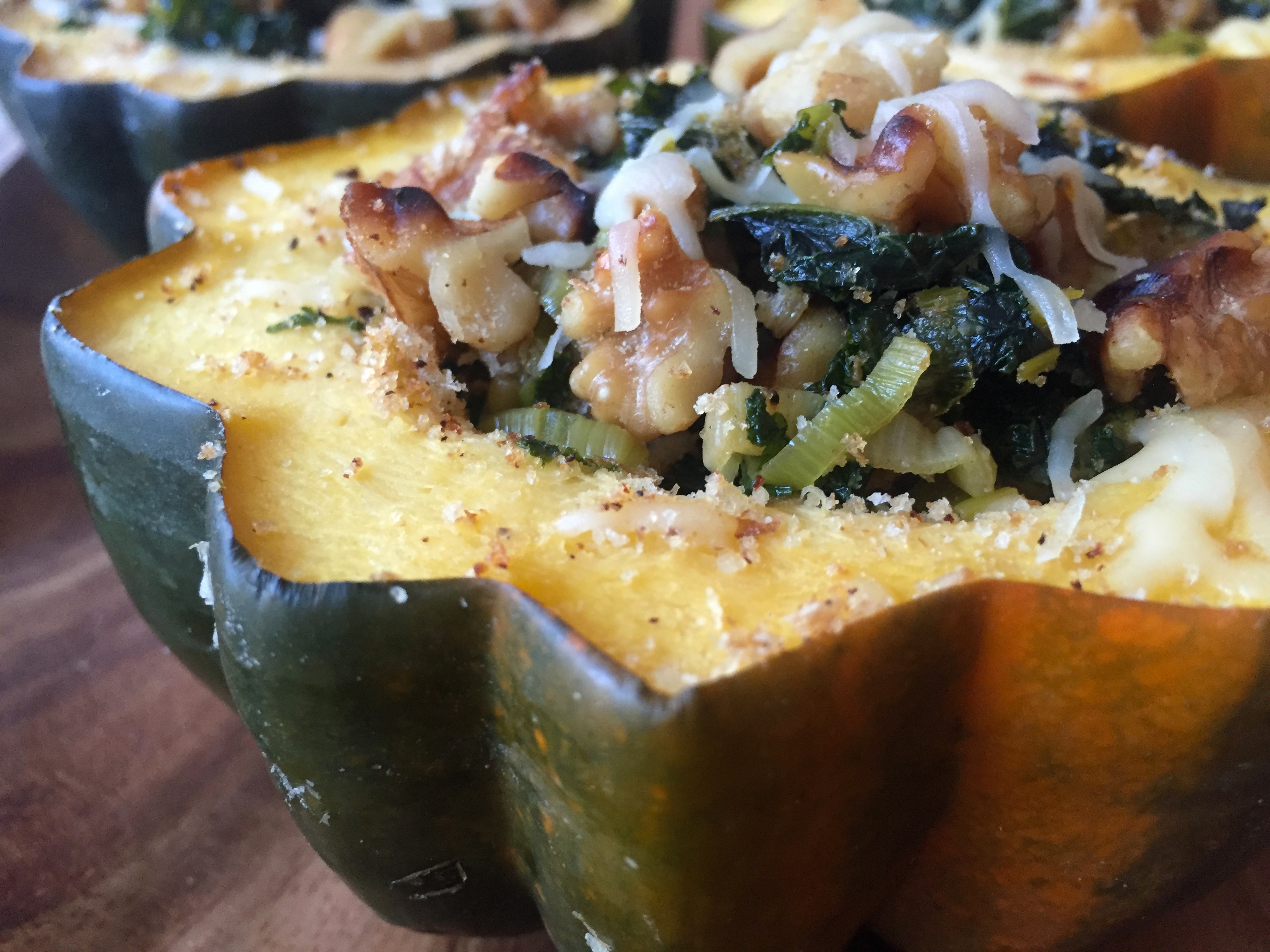 - Take down the oven heat to 350. Once the squash is finished cooking, set aside to slightly cool then stuff each squash to the brim with the filling. Top each squash with walnuts, Parmesan cheese and breadcrumbs. Sprinkle the edges of the squash with a little salt and pepper. Place the stuffed squash on a baking sheet and cook in the oven for 15 minutes.