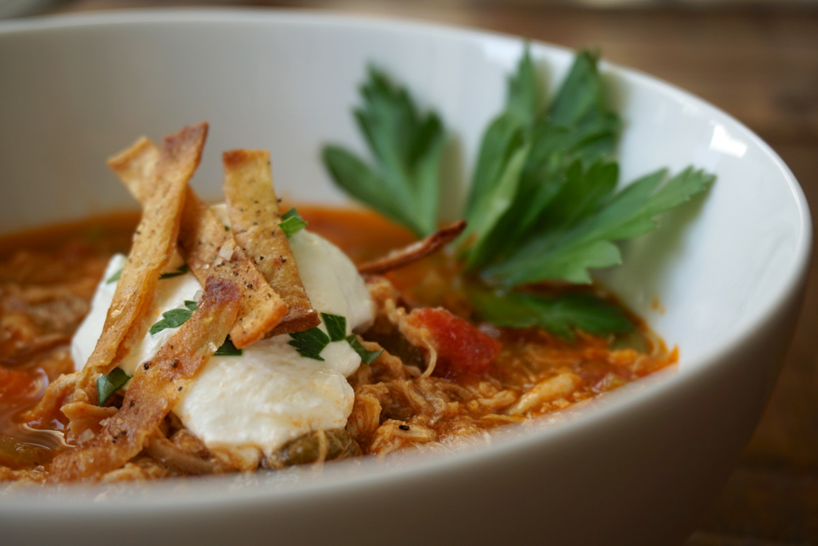 Now comes the best part: the toppings! Garnish with sour cream, fried tortilla strips, avocado, cheddar cheese or even some extra green chili. If you want to skip frying the strips, just use regular crushed-up tortilla chips. Enjoy!